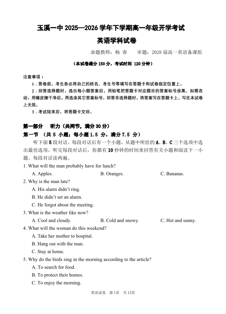 高一英语--云南省玉溪市一中2025-2026学年高一下学期开学考试