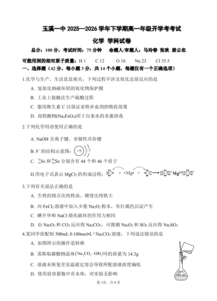 高一化学--云南省玉溪市一中2025-2026学年高一下学期开学考试