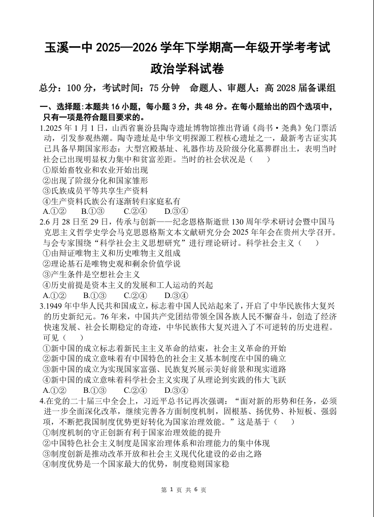 高一政治--云南省玉溪市一中2025-2026学年高一下学期开学考试