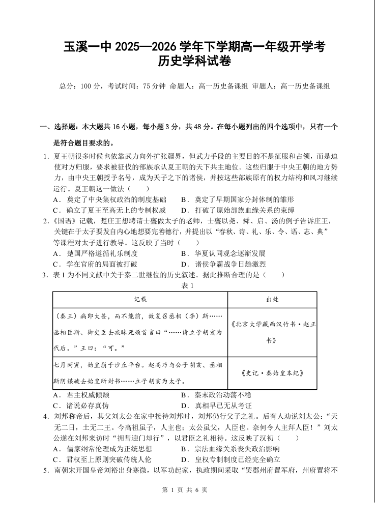 高一历史--云南省玉溪市一中2025-2026学年高一下学期开学考试