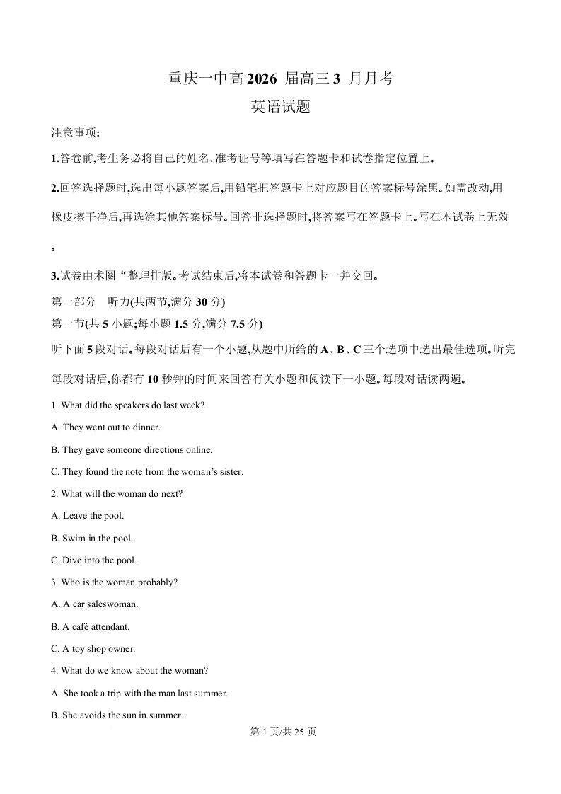 高三英语(解析版)--重庆市第一中学2026届高三下学期3月月考