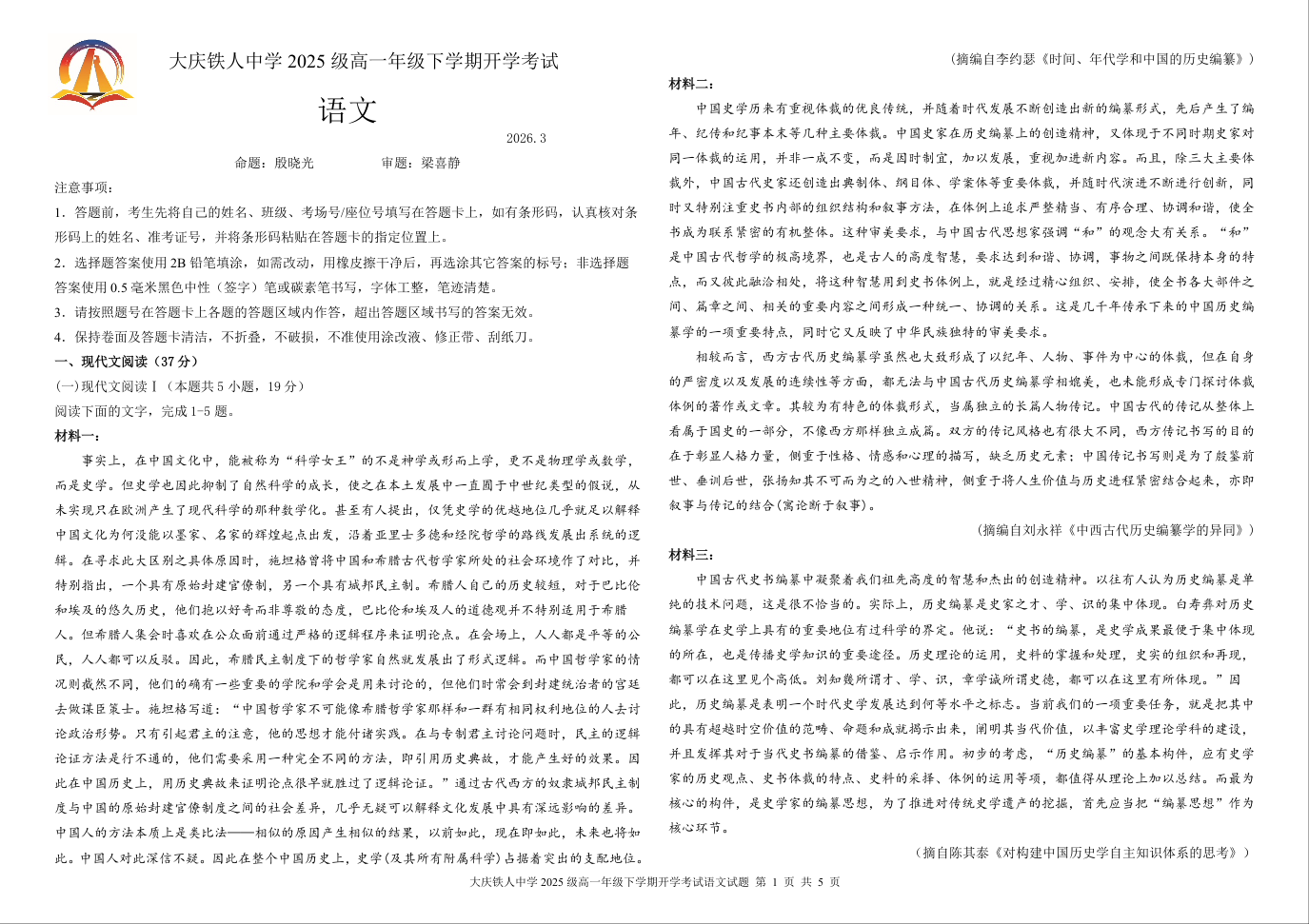 高一语文--黑龙江省大庆铁人中学2025-2026学年高一下学期开学考试