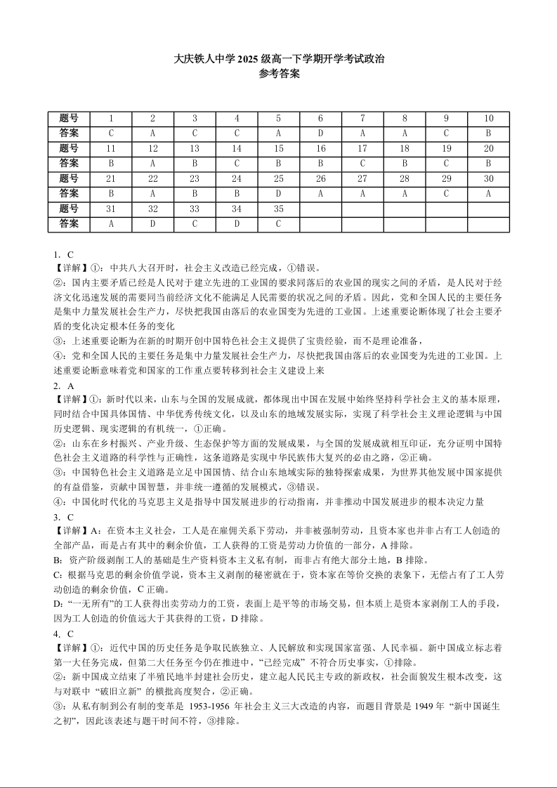高一政治答案--黑龙江省大庆铁人中学2025-2026学年高一下学期开学考试