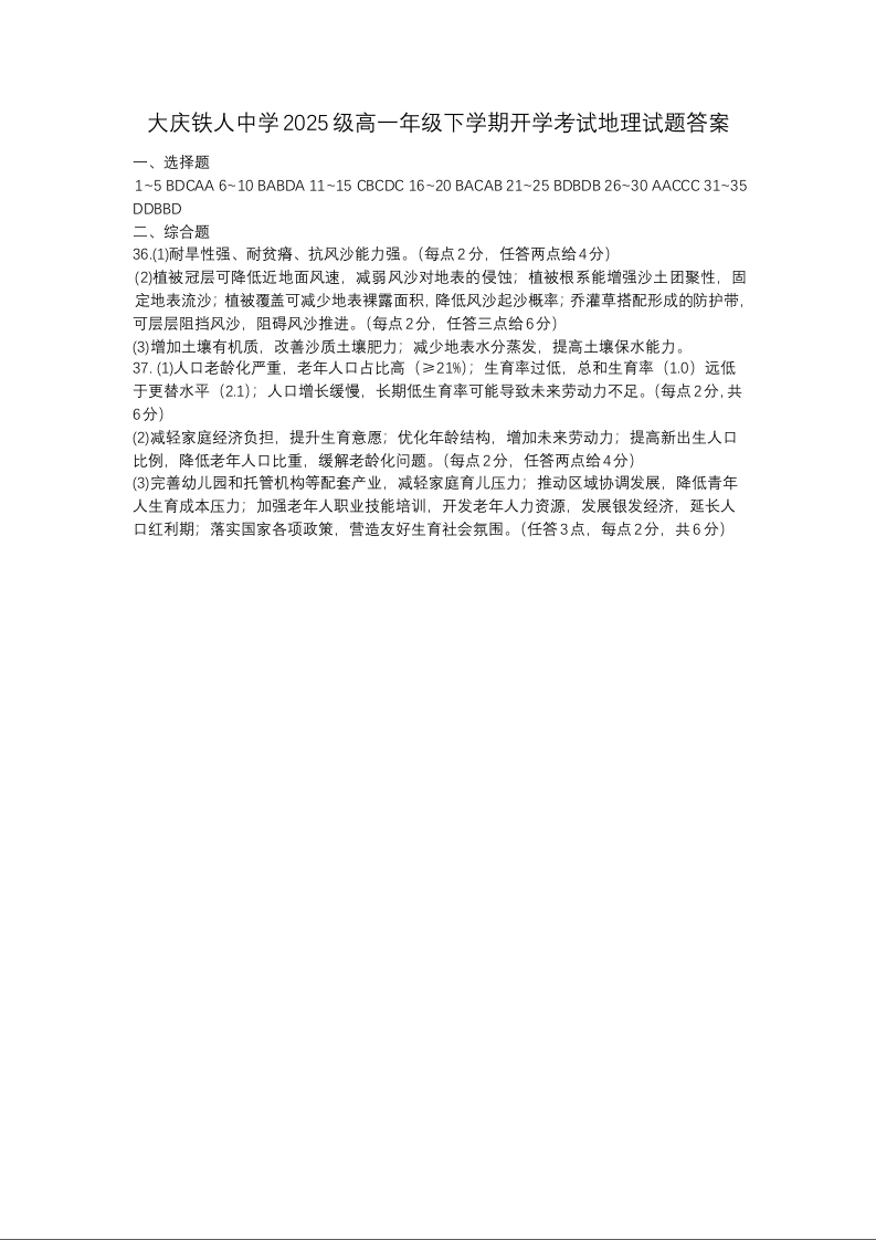 高一地理答案--黑龙江省大庆铁人中学2025-2026学年高一下学期开学考试