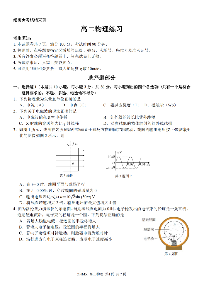 高二物理--浙江省浙南名校联盟2025-2026学年高二年级下学期返校(开学)考试