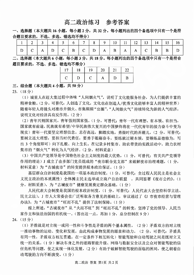 高二政治答案--浙江省浙南名校联盟2025-2026学年高二年级下学期返校(开学)考试