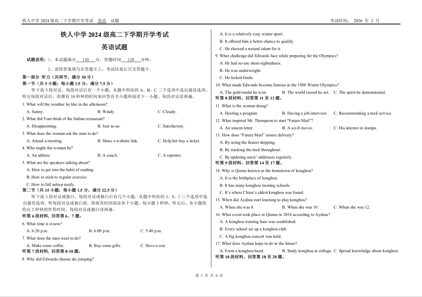 高二英语--黑龙江省大庆铁人中学2025-2026学年高二下学期开学考试