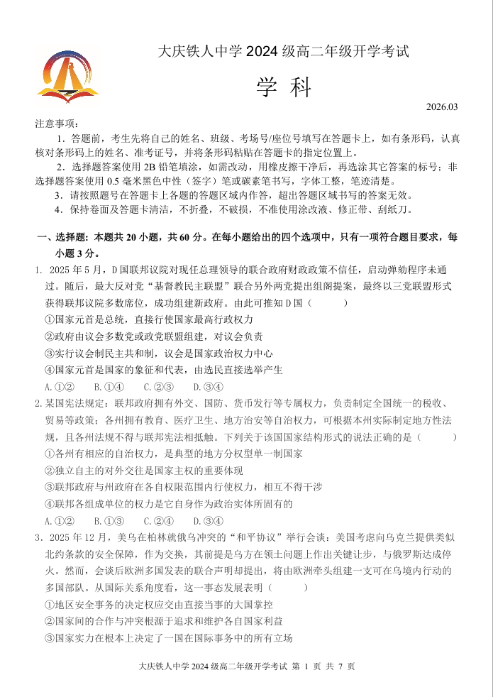 高二政治--黑龙江省大庆铁人中学2025-2026学年高二下学期开学考试