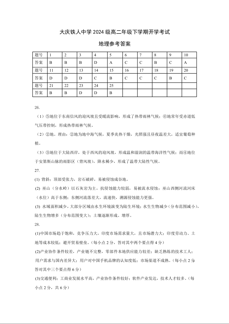 高二地理答案--黑龙江省大庆铁人中学2025-2026学年高二下学期开学考试