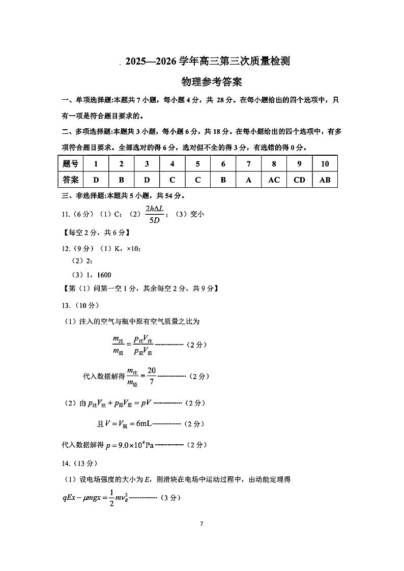 高三物理答案--河南许平洛济2026届高三第三次质量检测