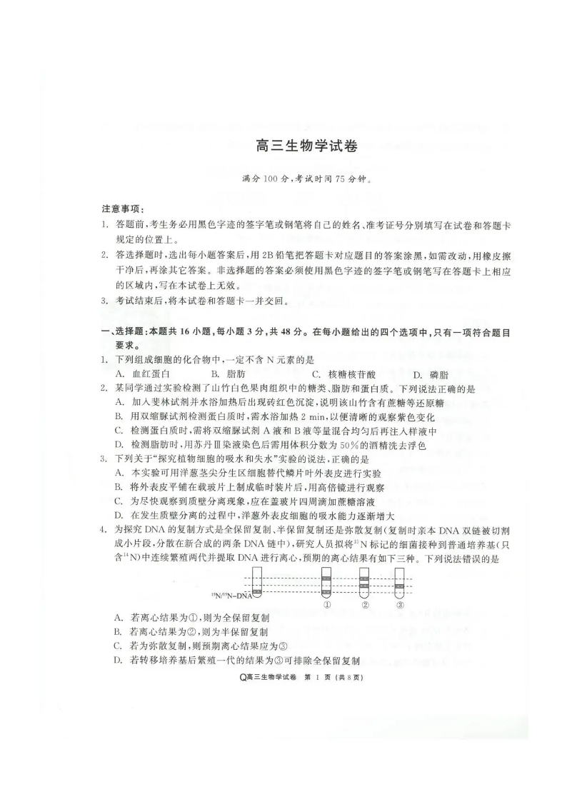 高三生物--青海省大通县朔山中学2026届高三下学期3月开学考试