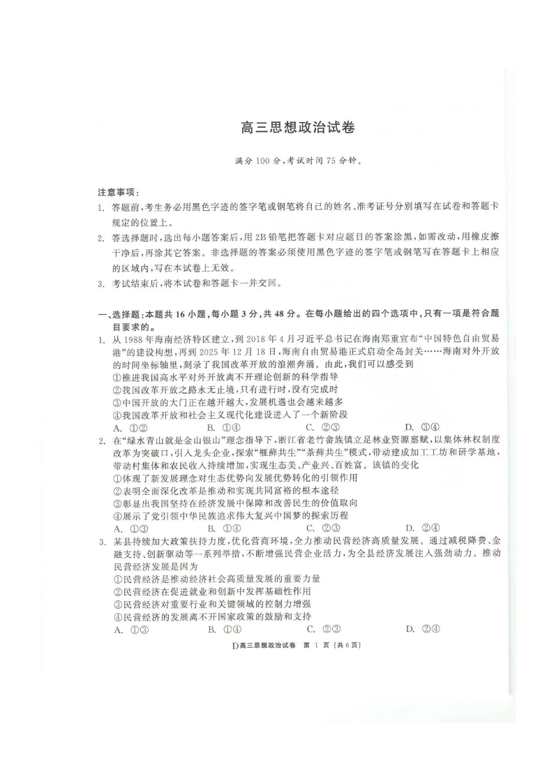 高三政治--青海省大通县朔山中学2026届高三下学期3月开学考试
