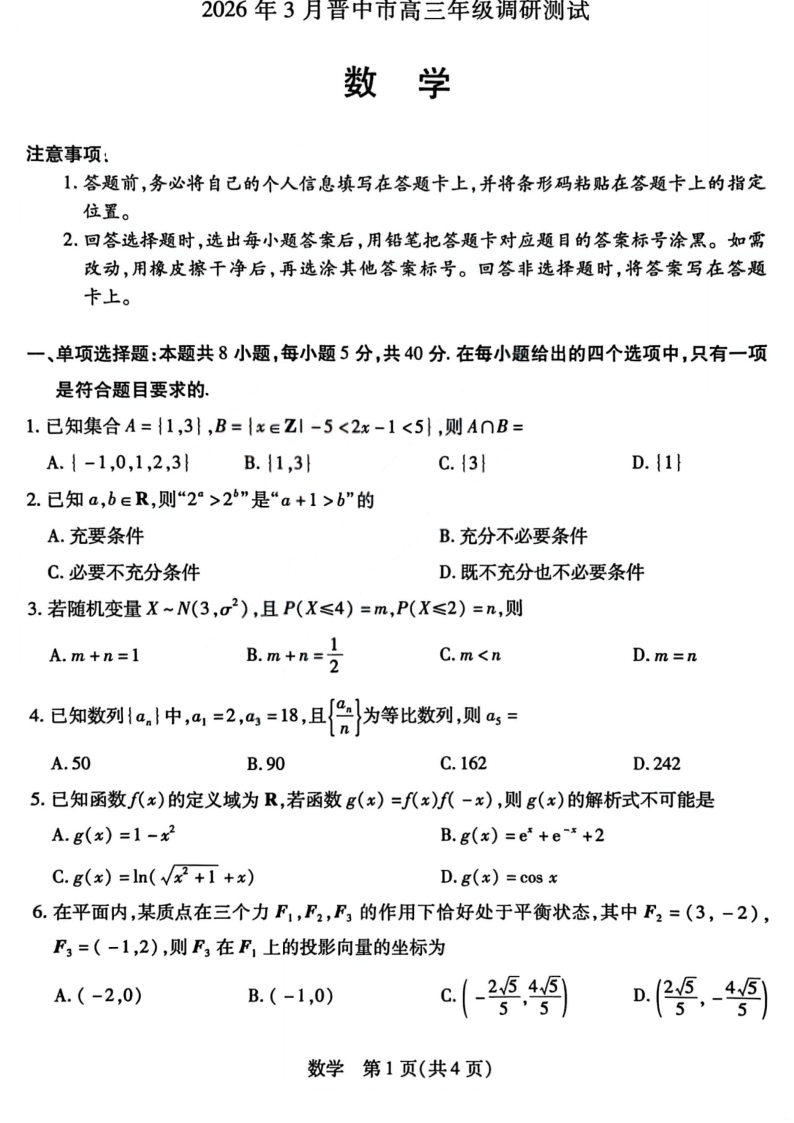 高三数学--山西省晋中市2026届高三年级3月调研测试