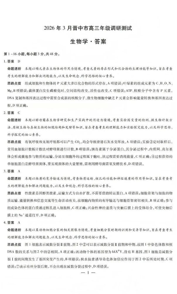高三生物答案--山西省晋中市2026届高三年级3月调研测试