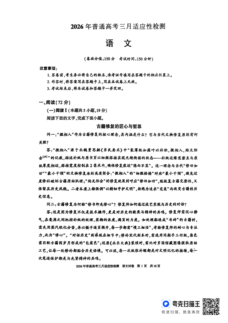高三语文--新疆2026届高三下学期三月适应性检测
