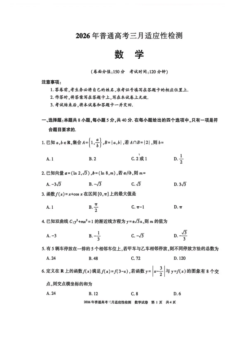 高三数学--新疆2026届高三下学期三月适应性检测