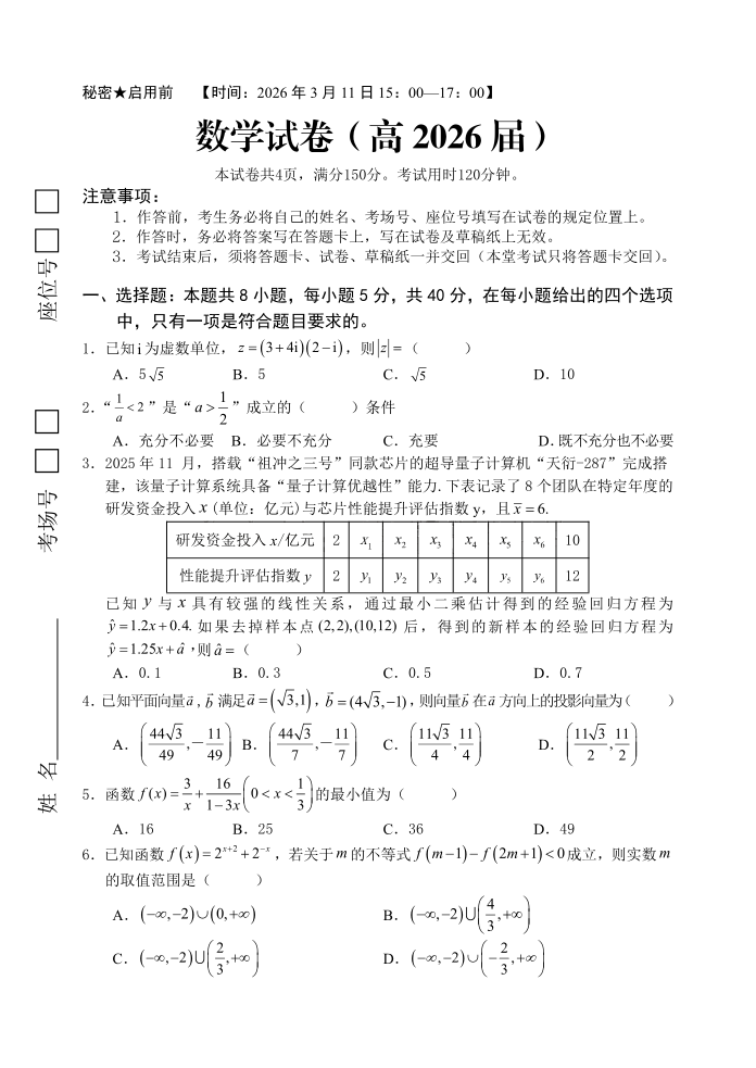 高三数学--重庆市名校联盟(七校联盟)2026届高三下学期3月开学联考