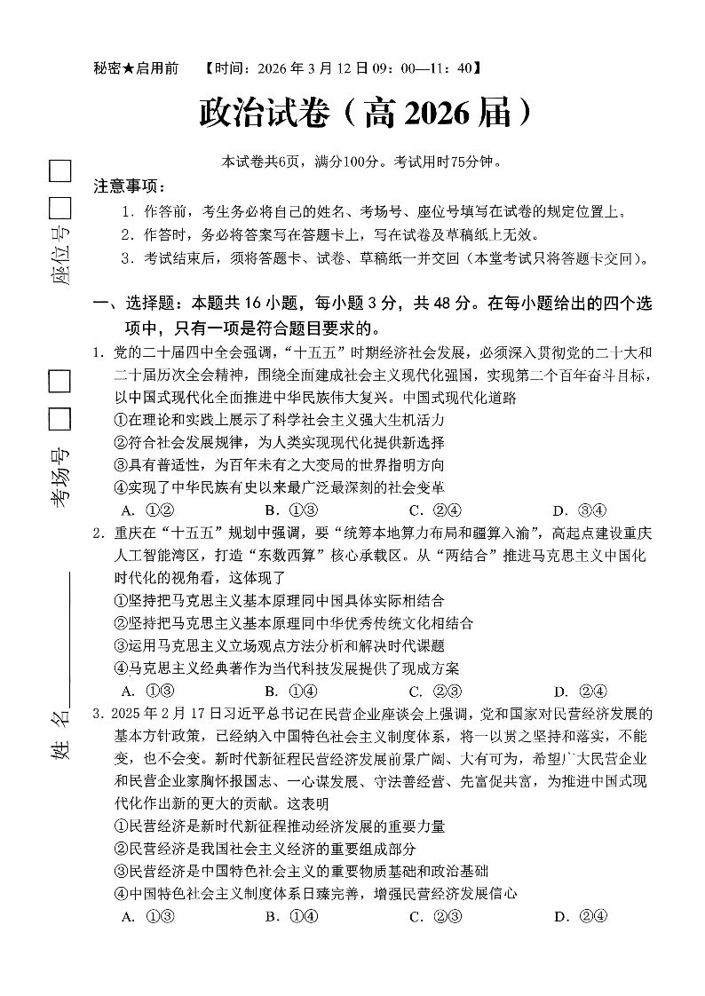 高三政治--重庆市名校联盟(七校联盟)2026届高三下学期3月开学联考