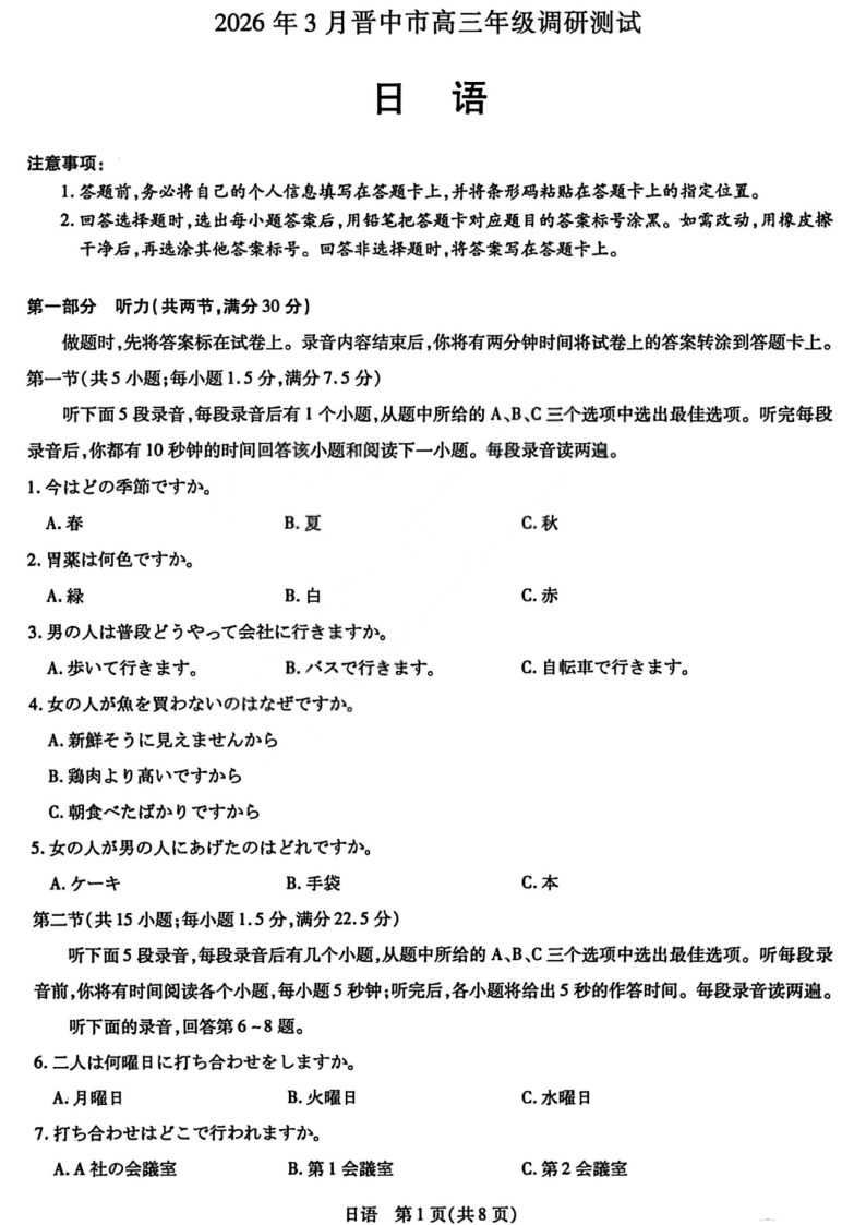 高三日语--山西省晋中市2026届高三年级3月调研测试