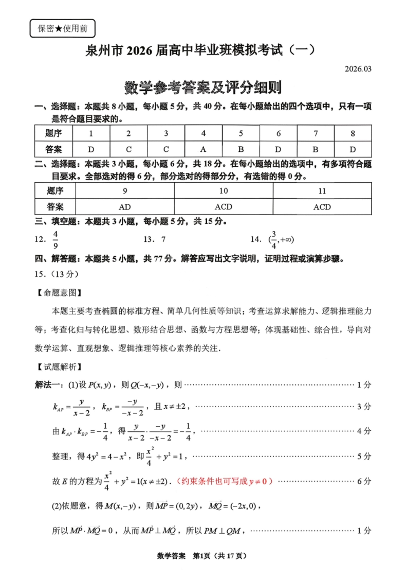 高三数学答案--福建省泉州市2026届高中毕业班模拟考试(一)