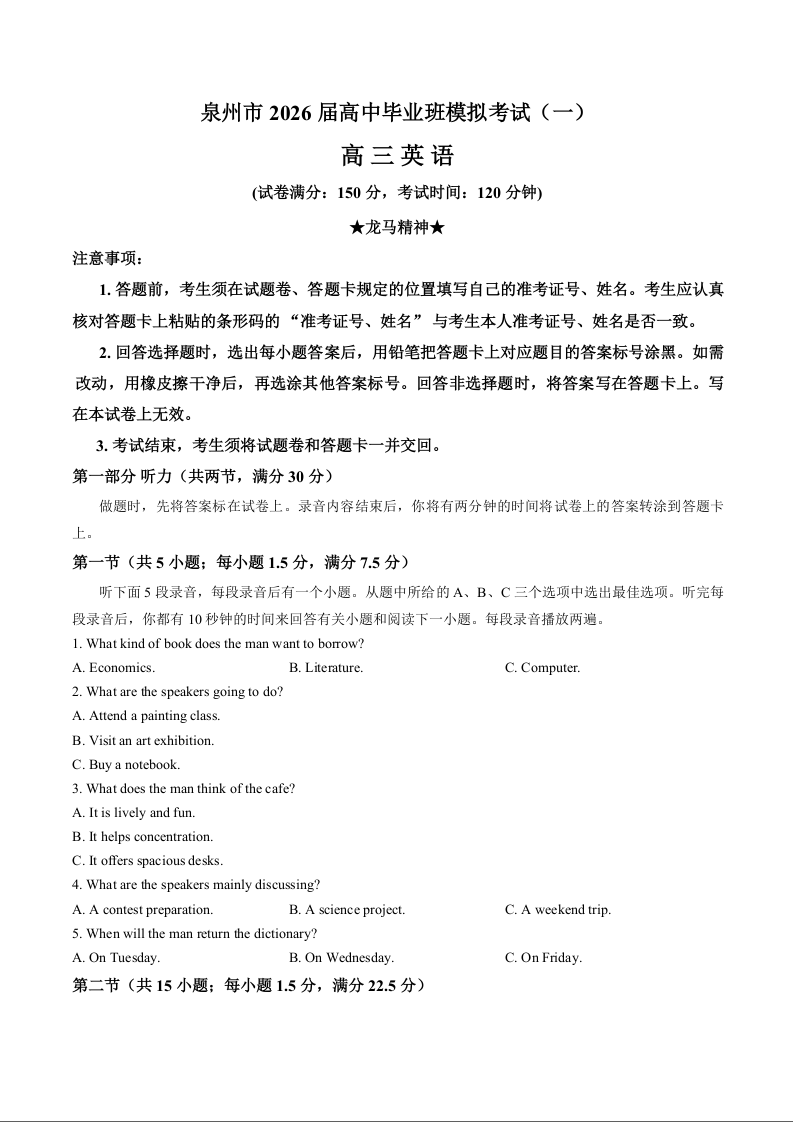 高三英语+答案--福建省泉州市2026届高中毕业班模拟考试(一)