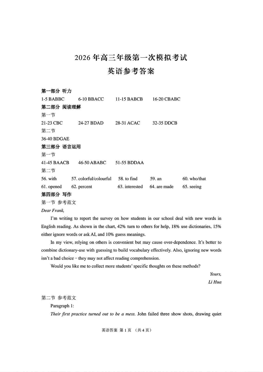 高三英语答案--甘肃省2026届高三第一次模拟考试(甘肃一诊)