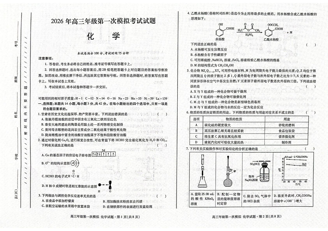 高三化学--甘肃省2026届高三第一次模拟考试(甘肃一诊)