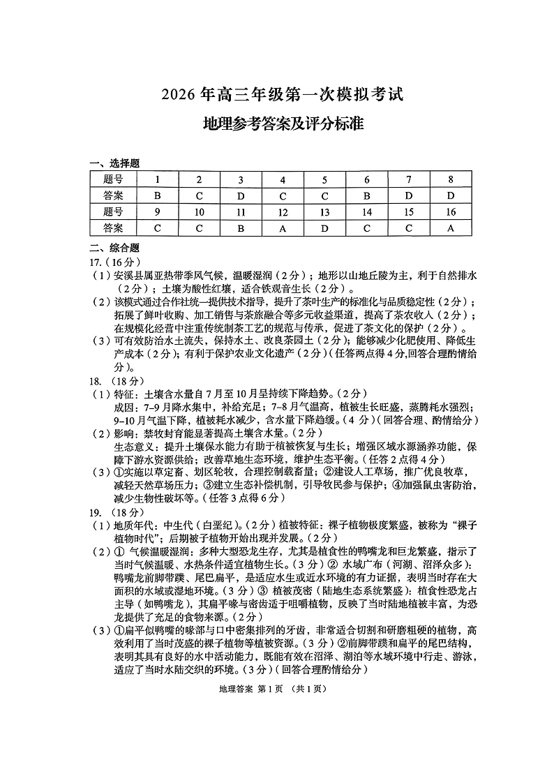 高三地理答案--甘肃省2026届高三第一次模拟考试(甘肃一诊)