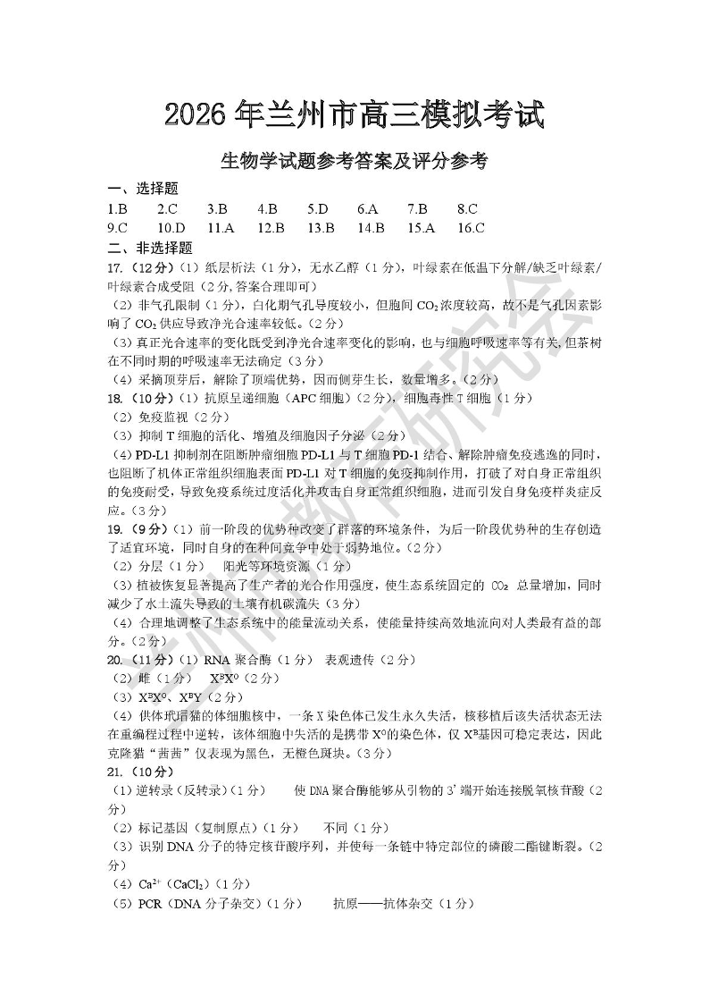 高三生物答案--甘肃省兰州市2026届高三下学期3月模拟考试(兰州一模)