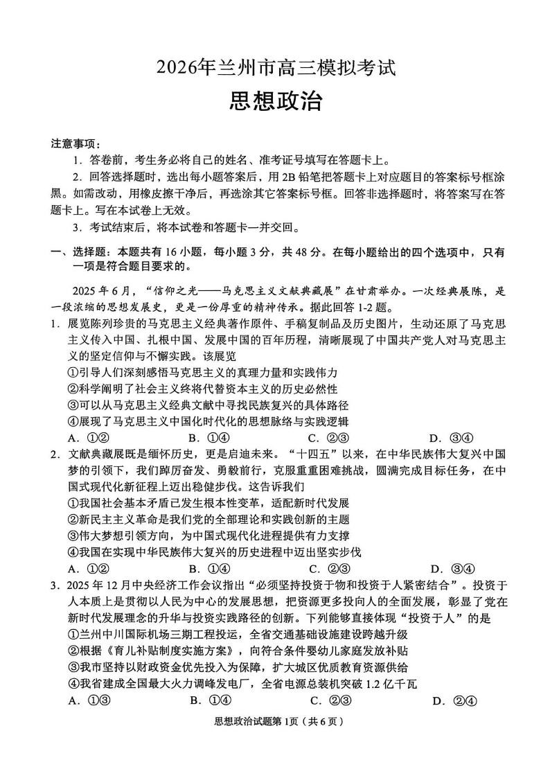 高三政治--甘肃省兰州市2026届高三下学期3月模拟考试(兰州一模)