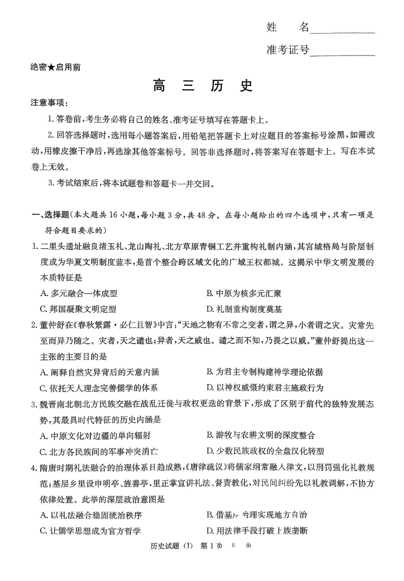 高三历史--湖南省九校联盟2026届高三第二次联考(暨怀化市一模)