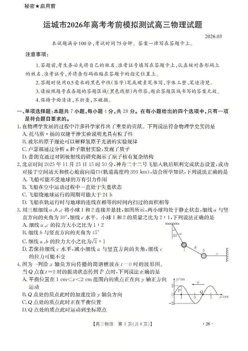 高三物理--山西运城市2026届高考考前模拟测试(运城一模)