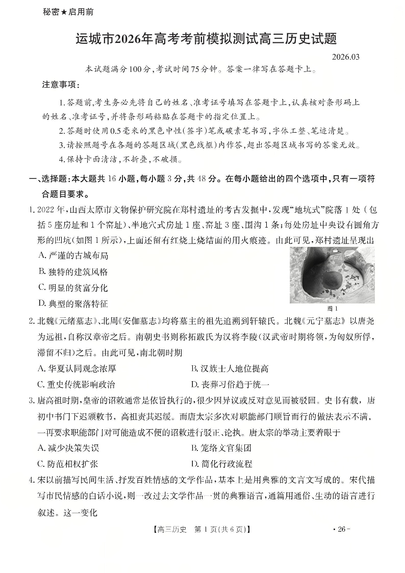 高三历史--山西运城市2026届高考考前模拟测试(运城一模)