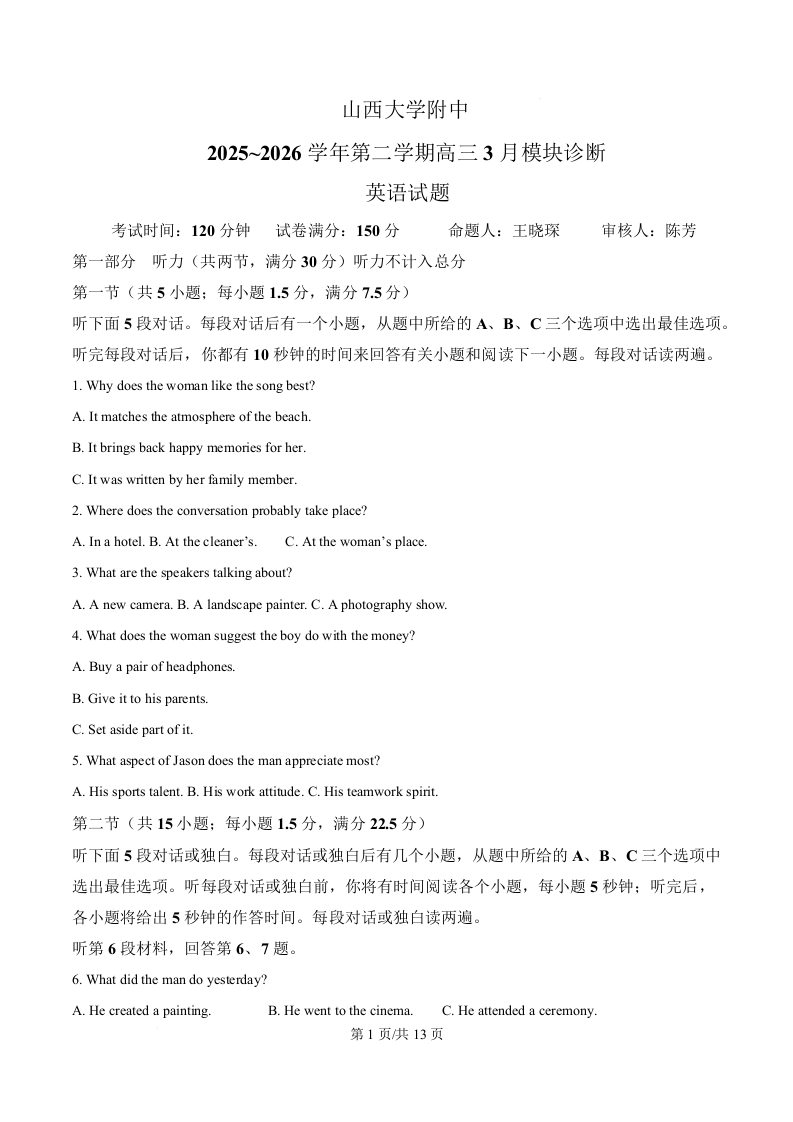 高三英语(原卷版)--山西大学附属中学校2026届高三年级第二学期3月模块诊断