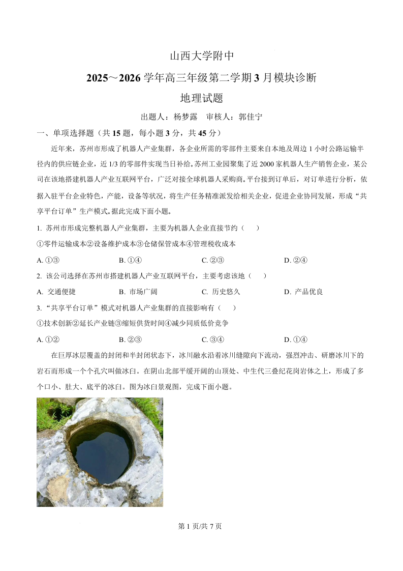 高三地理(原卷版)--山西大学附属中学校2026届高三年级第二学期3月模块诊断