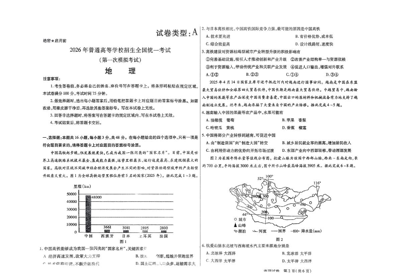 高三地理--内蒙古包头市 2026 届高三第一次模拟考试(包头一模)