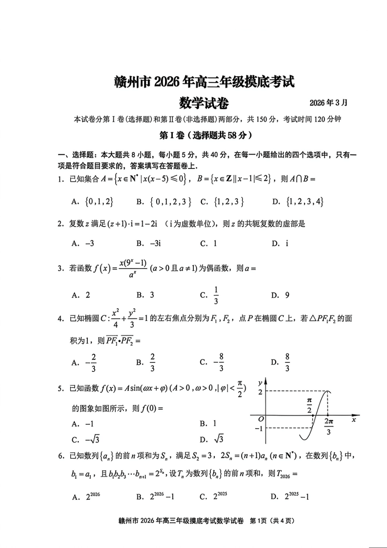 高三数学--江西省赣州市2026届高三下学期3月摸底考试
