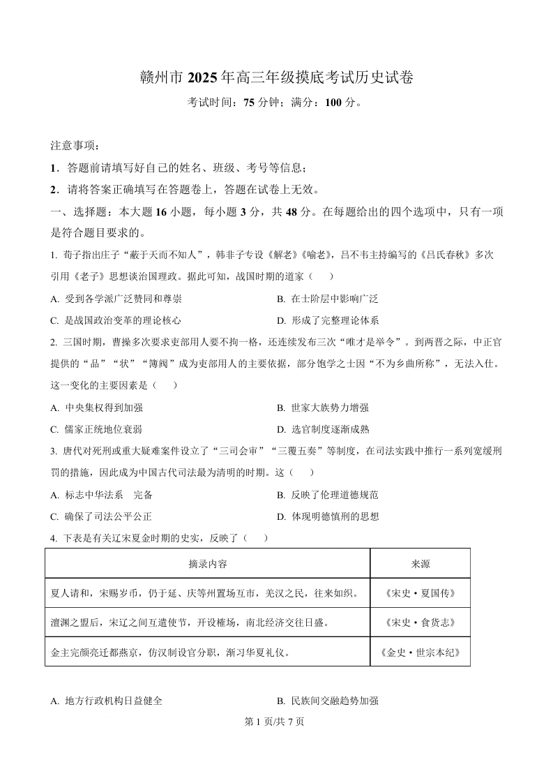 高三历史(原卷版)--江西省赣州市2026届高三下学期3月摸底考试