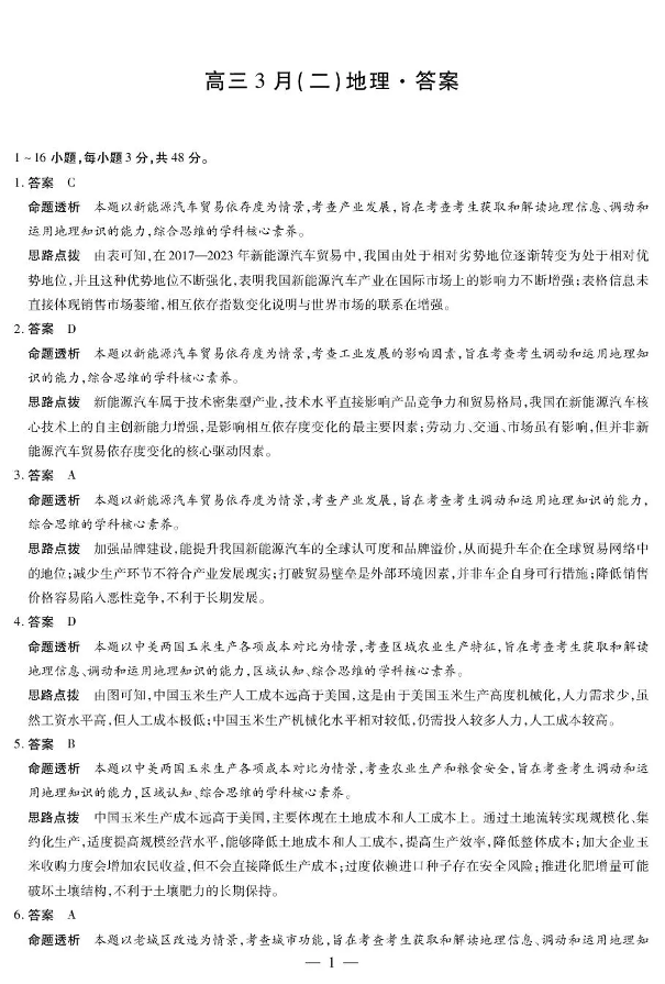 高三地理答案--安徽省合肥市第八中学2026届高三下学期3月模拟预测(二)