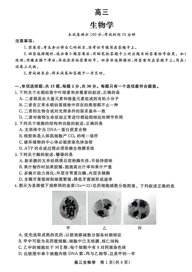 高三生物--江苏省九校重点高中2026届高三下学期3月联考