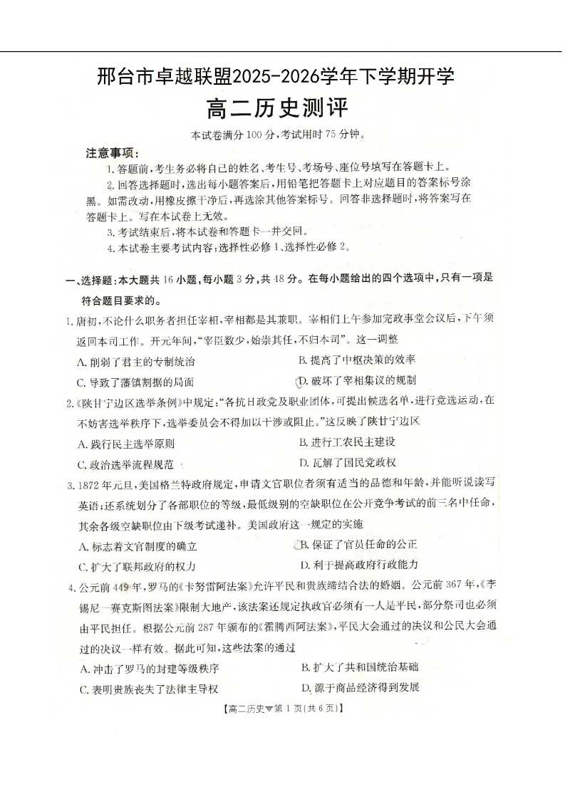 高二历史--河北省邢台市卓越联盟2025-2026学年高二下学期开学测评