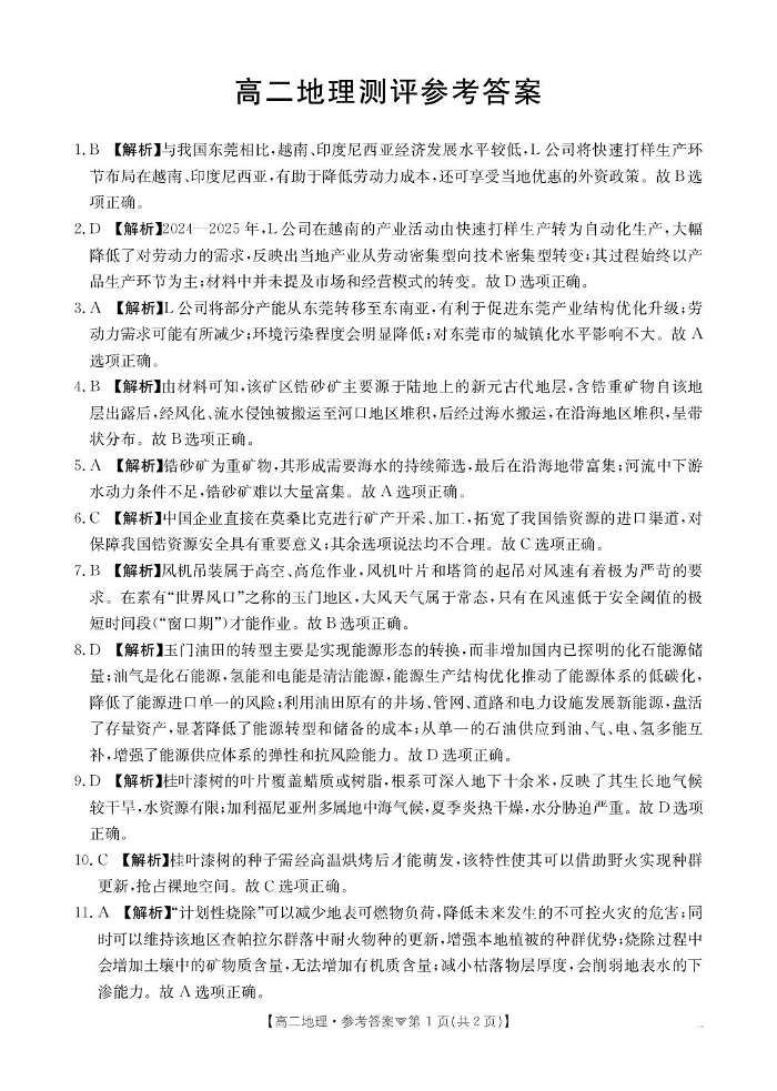 高二地理答案--河北省邢台市卓越联盟2025-2026学年高二下学期开学测评