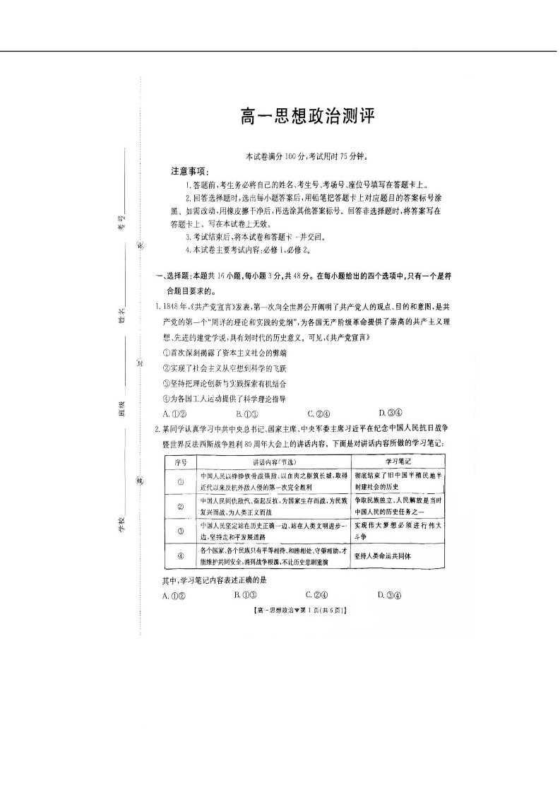高一政治+答案--河北省邢台市卓越联盟2025-2026学年高一下学期开学测评考试