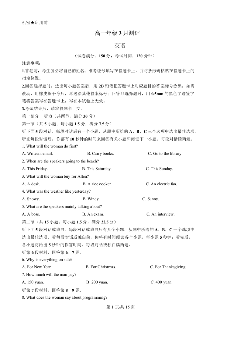 高一英语+答案--河南省新未来联考2025-2026学年高一下学期3月测评考试