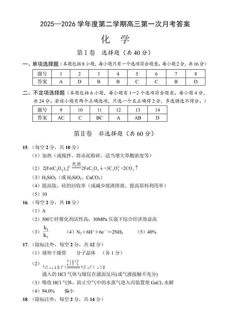 高三化学答案--海南省文昌中学2026届高三第二学期第一次月考