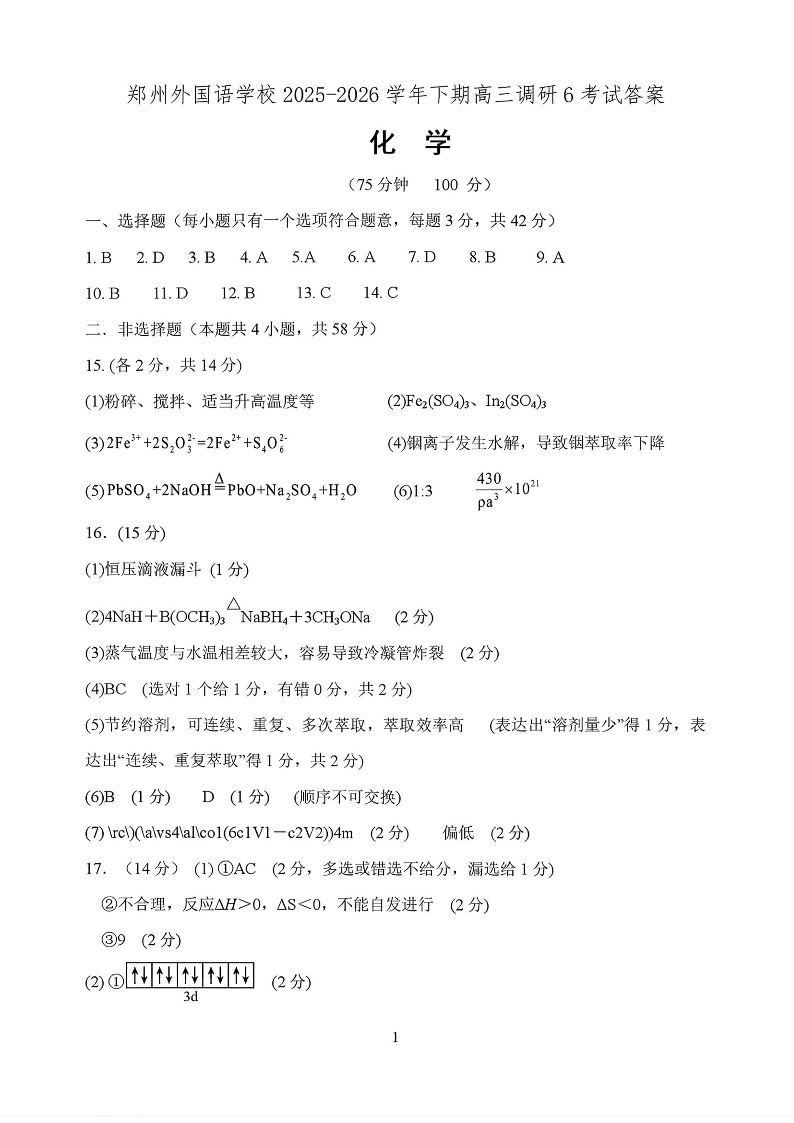 高三化学答案--河南郑州市外国语学校2026届高三下学期3月阶段检测