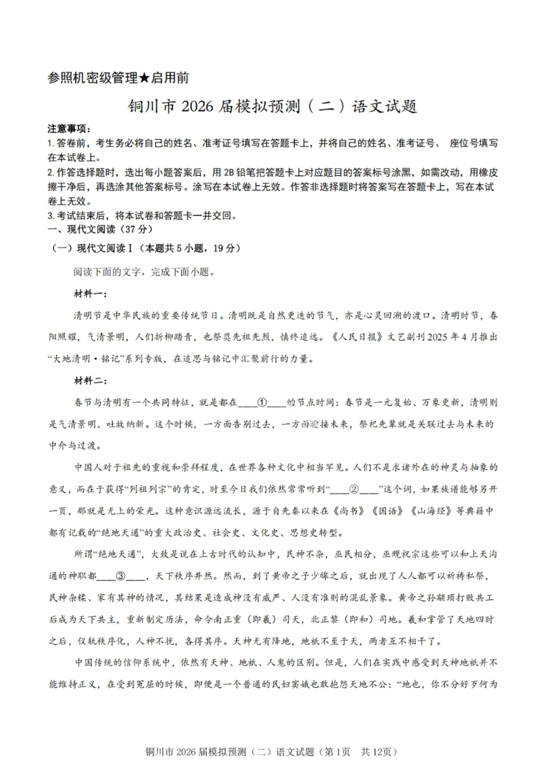 高三语文--陕西省铜川市2026届高三第二次模拟考试(铜川二模)