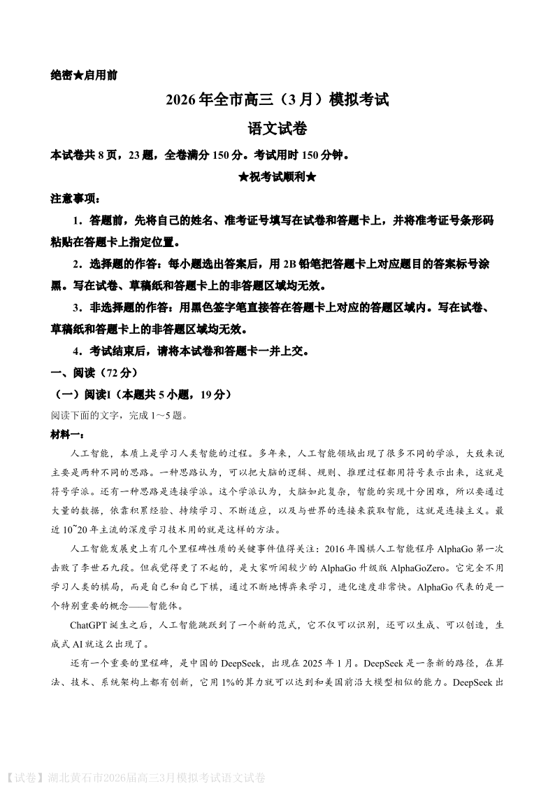 高三语文--湖北省黄石市2026届高三下学期3月模拟考试