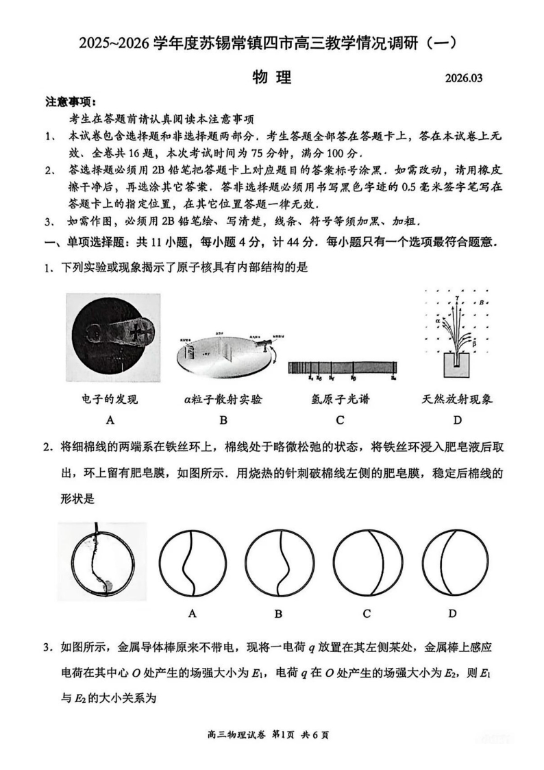 高三物理+答案--江苏省苏锡常镇四市高三下学期3月教学情况调研(一)