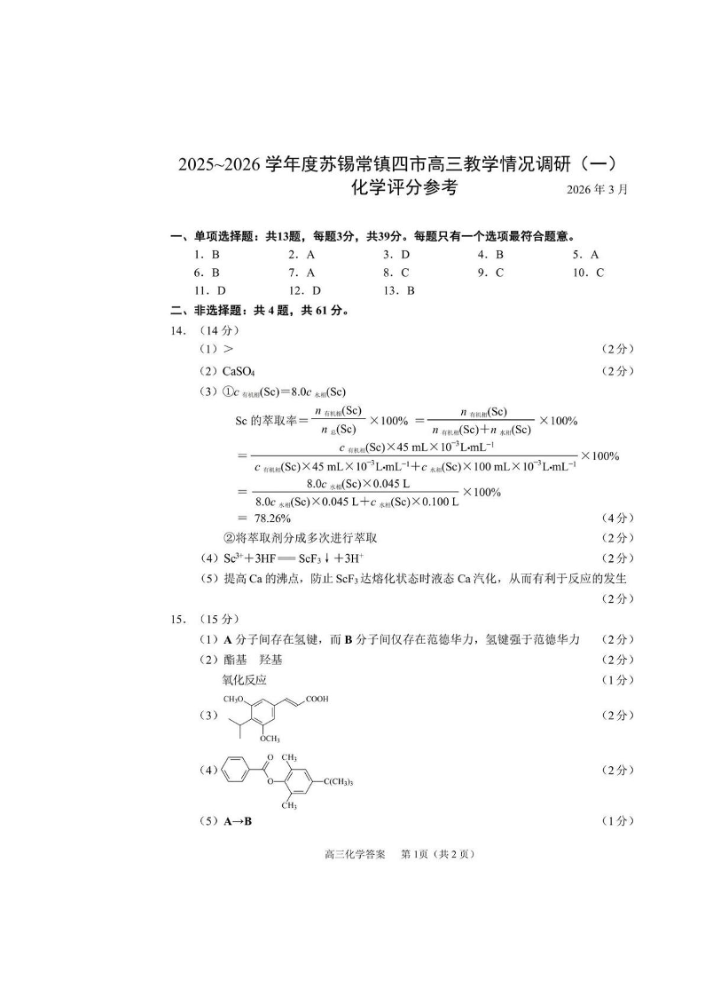高三化学答案--江苏省苏锡常镇四市高三下学期3月教学情况调研(一)